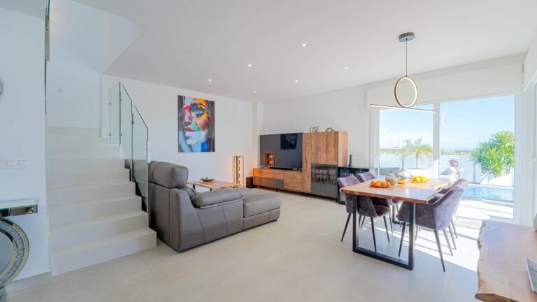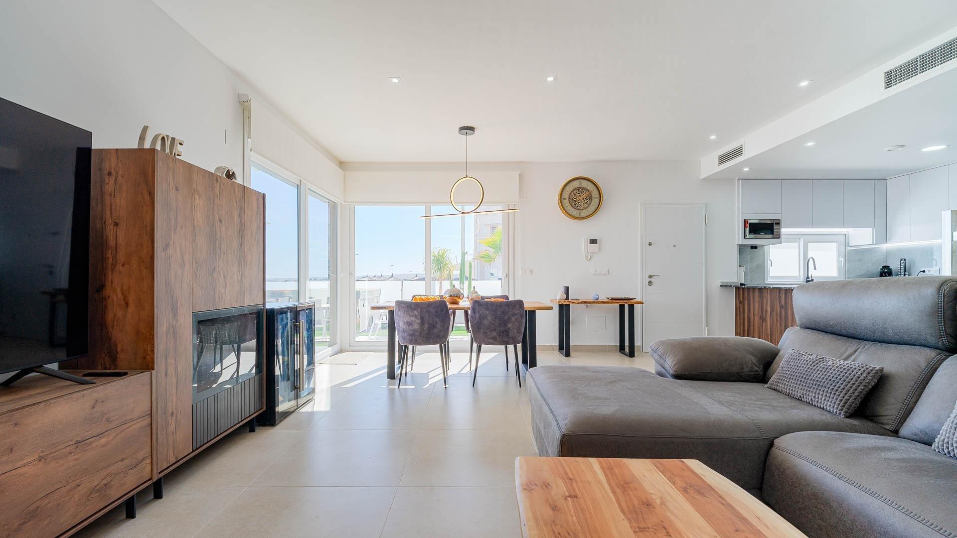 Der Wohnbereich umfasst ein geräumiges Wohnzimmer mit integrierter Küche und fließendem Übergang in den Außenbereich. Die Immobilie verfügt über drei Schlafzimmer, zwei im Erdgeschoss und eines im Obergeschoss. Zwei der Schlafzimmer haben ein eigenes Bad und einen Ankleideraum, während das Schlafzimmer im Obergeschoss direkten Zugang zu einer privaten Terrasse mit zusätzlicher Außenküche bietet.