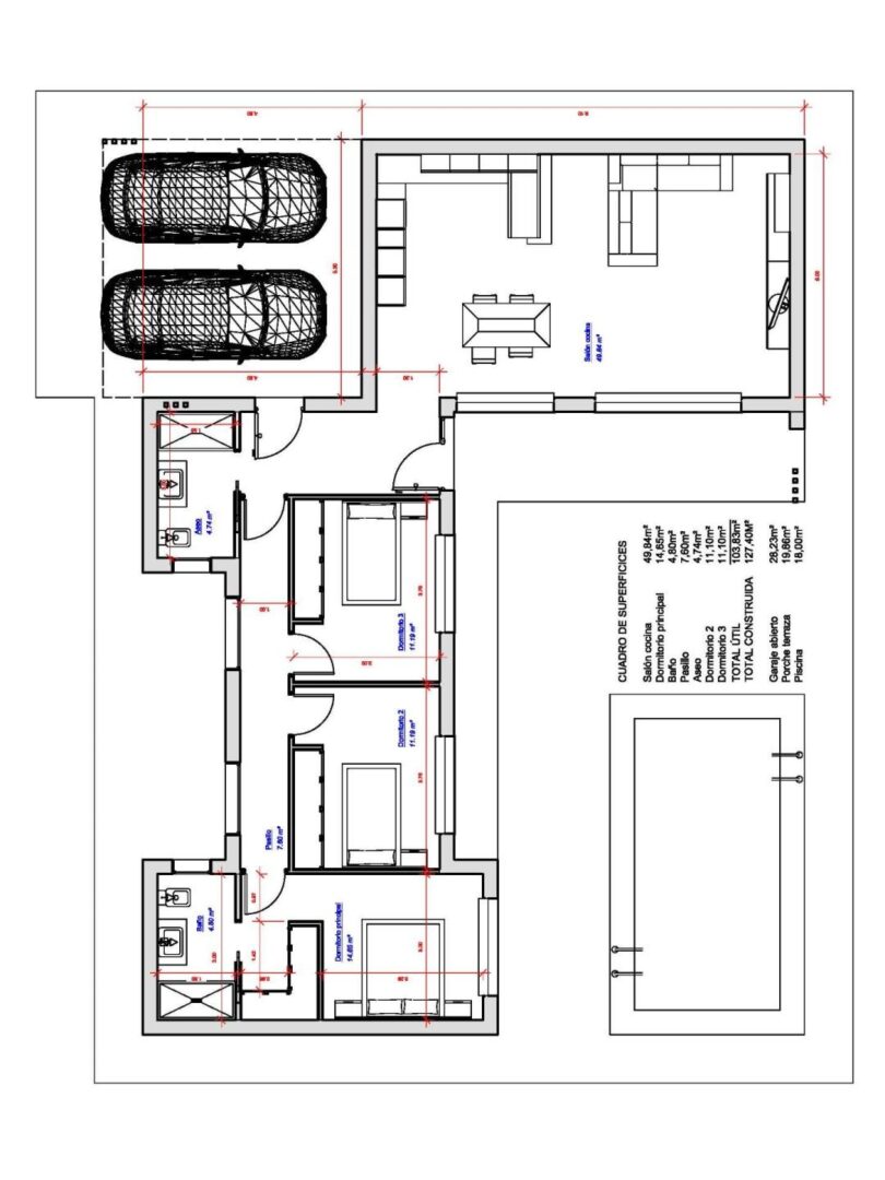 Die Villa ist auf einer Ebene verteilt und verfügt über 3 Schlafzimmer und 2 Badezimmer, eines davon en suite. Der offene Grundriss folgt einem L-förmigen Design, das den Wohnbereich vom Schlafbereich trennt und so für zusätzlichen Komfort und Privatsphäre sorgt. Der Tagesbereich verfügt über hohe Decken, die das Raumgefühl verstärken und den Innenraum mit natürlichem Licht durchfluten.