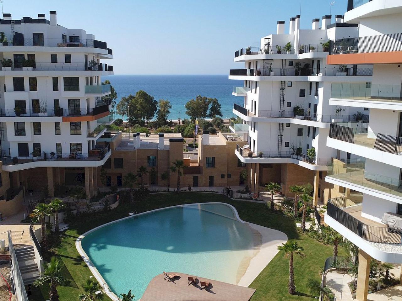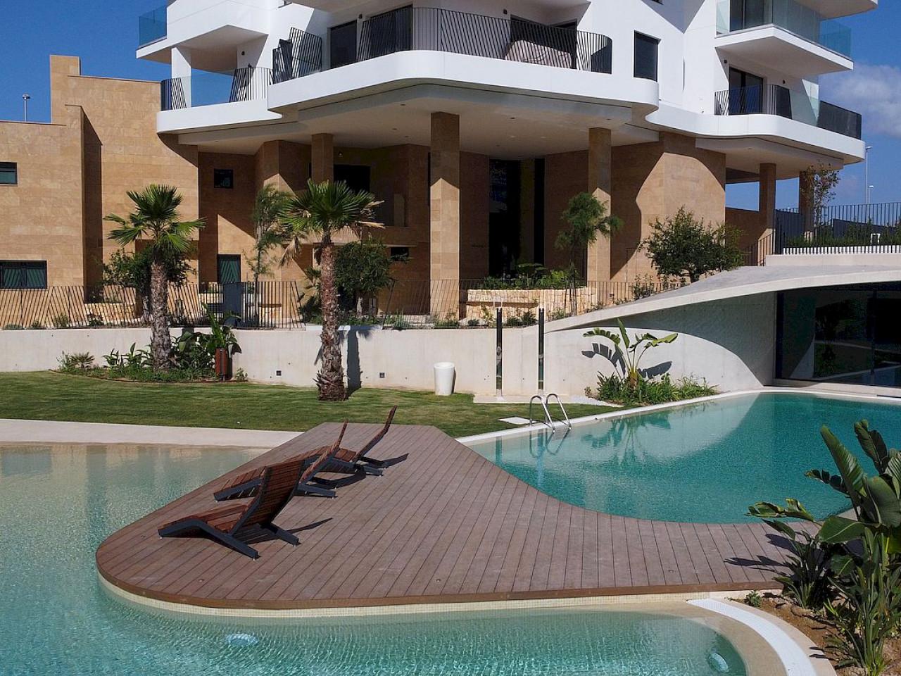Die Anlage besteht aus Ein-, Zwei- und Dreizimmerwohnungen (mit Einbauschränken), einem oder zwei Badezimmern (en-suite zum Hauptschlafzimmer in der Drei-Schlafzimmer Variante), voll ausgestatteter moderner Küche (einschließlich Haushaltsgeräte) und offenem Wohn-/Esszimmer, das zu einer großen Terrasse mit Blick auf das Gemeinschaftsschwimmbad und die Landschaftsgärten, die bis zum Mittelmeer führen.
