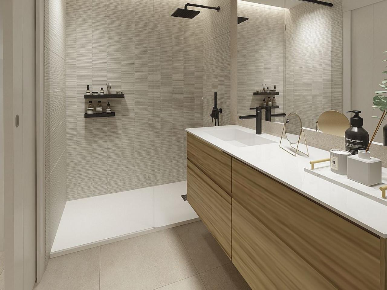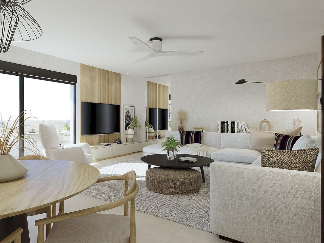 Moderne Eigenschaften mit 3 Schlafzimmern und 2 Bädern, ein geräumiges Wohnzimmer mit offener Küche und Schiebefenster, die Zugang zur Terrasse geben.
