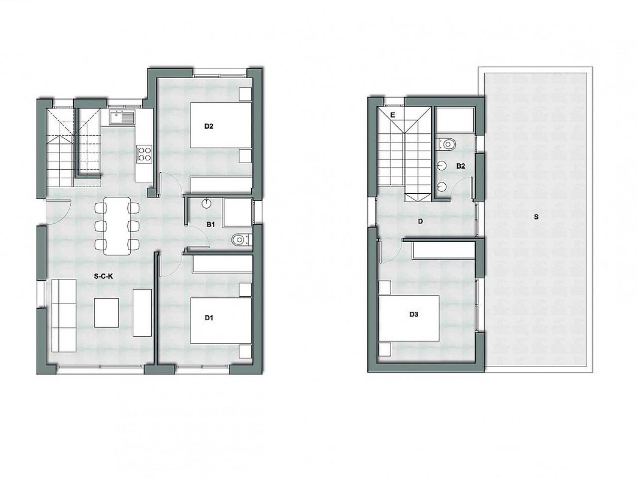 Villen mit 2 oder 3 Schlafzimmer, 2 Bäder, Wohnzimmer, Küche, Veranda im Erdgeschoss, große Sonnenterrasse im ersten Stock und Garten mit privatem Parkplatz.