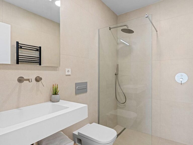Die Wohnungen bestehen aus drei Doppelschlafzimmern (alle mit Einbauschränken), zwei Badezimmern (en-suite im Hauptschlafzimmer) und einer Toilette, einer voll ausgestatteten modernen Küche (mit Frühstücksbar) und einem offenen Wohn-/Essbereich, der zum großzügigen gefliesten Garten und dem privaten Swimmingpool führt.