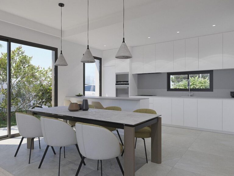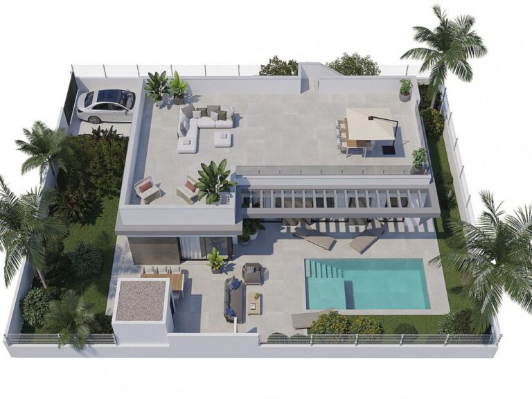 Das architektonische Design und die breite Verteilung auf einer Etage, ermöglicht allen Zimmern einen direkten Zugang zum privaten Pool und Grillplatz durch große Fenster. Darüber hinaus wird Sie die spektakuläre 100m2 große Sonnenterrasse mit direktem Zugang vom Garten aus mit ihren Sonnenuntergängen und dem Blick auf das Mittelmeer verzaubern.