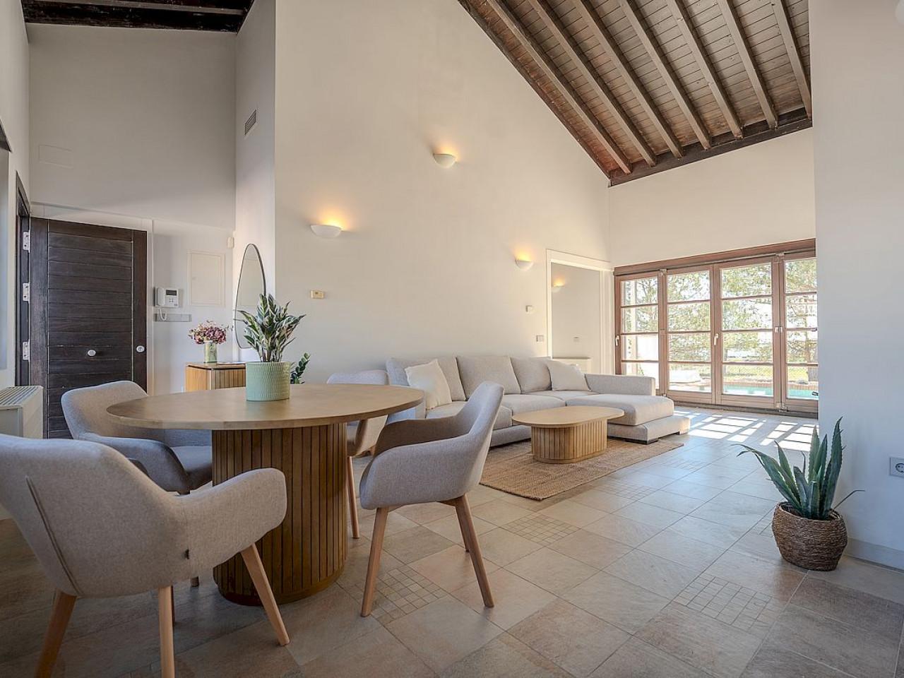 Es besteht aus zwei Schlafzimmern, zwei Bädern, einer Küche mit Waschküche und einem großen Ess- und Wohnzimmer mit zwei riesigen Fenstertüren, die der Wohnung unter dem beeindruckenden Holzbalkendach eine außergewöhnliche Helligkeit verleihen.
