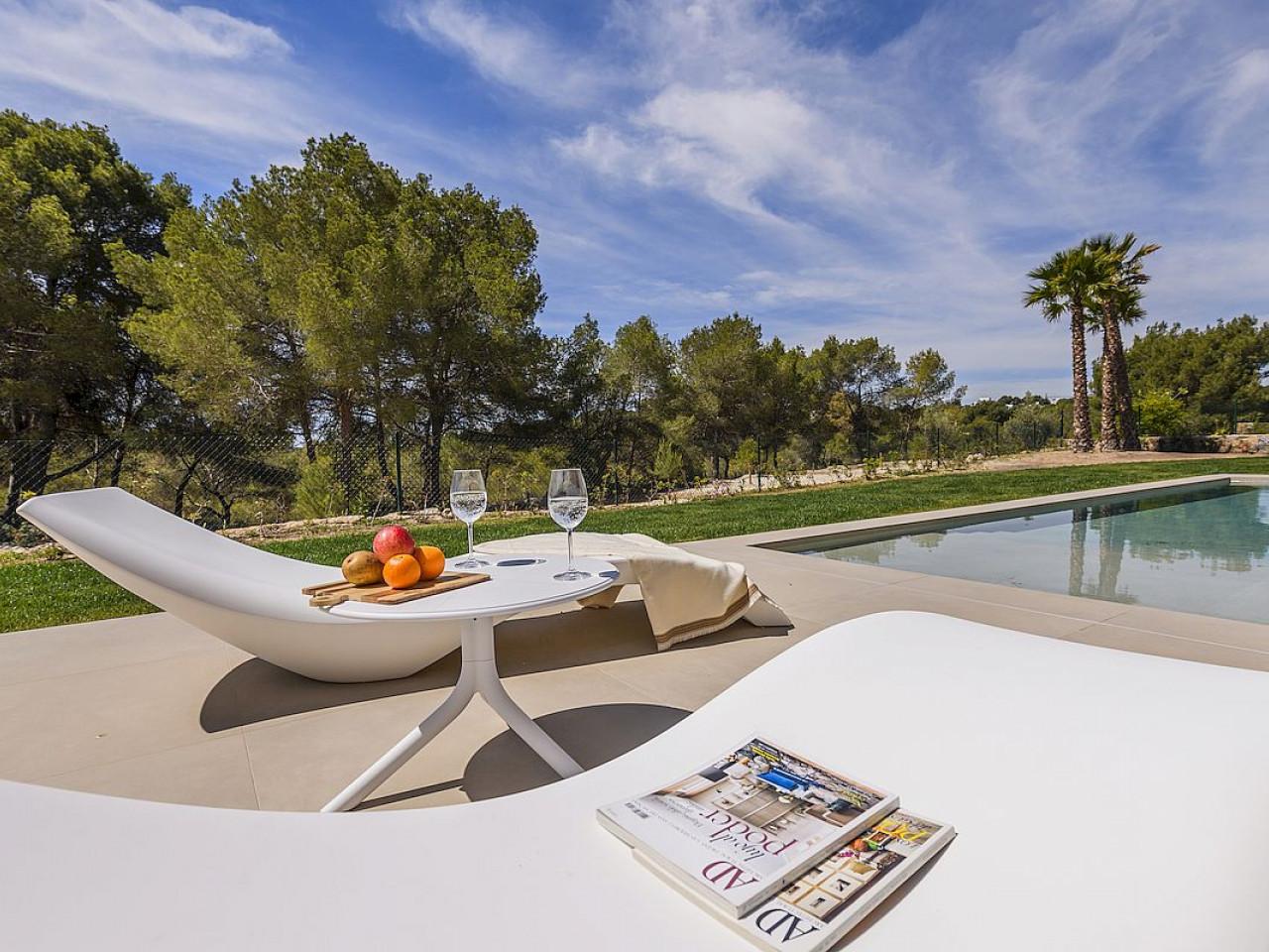 Im Erdgeschoss befinden sich eine offene Küche, ein Wohn- und Essbereich mit Türen, die zu den großzügigen Gärten und dem Schwimmbadbereich führen.
