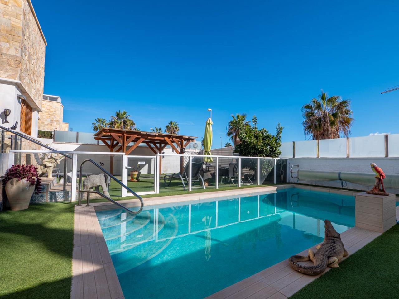 Draußen erwartet Sie eine private Oase mit einem modernen Swimmingpool, der zum Entspannen und Genießen des schönen mediterranen Klimas einlädt. Die fantastische Sonnenterrasse bietet den perfekten Platz, um im Freien zu speisen und die Sonne aufzusaugen. Die überdachte Terrasse auf der Rückseite des Hauses bietet noch mehr Lebensraum, der sich perfekt für Unterhaltungen, zum Entspannen oder als gemütlicher Rückzugsort eignet.